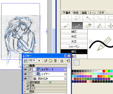 ビギナーズアシスタントを使うと、読み込んだレイヤがどうしても下絵になってくれないので、その上に ウィンドウズ→レイヤ でレイヤを表示させて、読み込みレイヤの上に下書きレイヤを持ってくる。