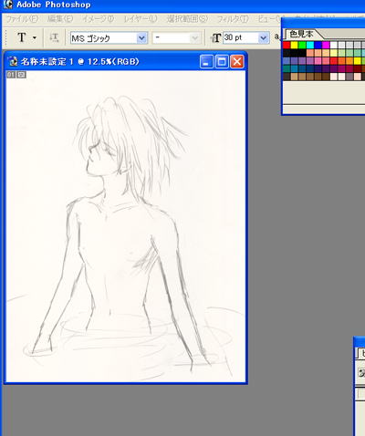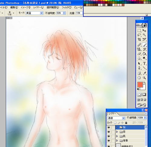 4、色付けは、各パーツごとに、ホントに無造作にファイルをつくってレイヤをかさねます。範囲指定はしません。薄い色から塗っていきます。
